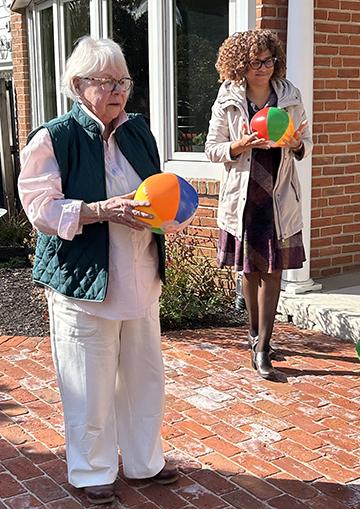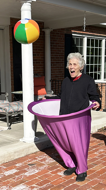 We had so much fun together, especially outside on the patio, playing silly games Lorraine brought with her from New York. Sister Christine, like the good sport she is, agreed to wear the “Cabrini pants” for a funny game of ball toss. Everyone tried ring toss too.